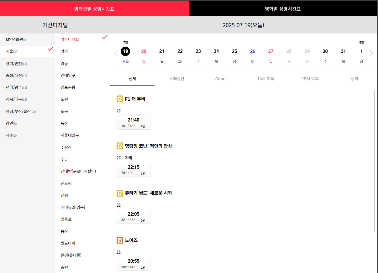 - 원하는 지점 클릭 → '상영시간표' 바로 노출