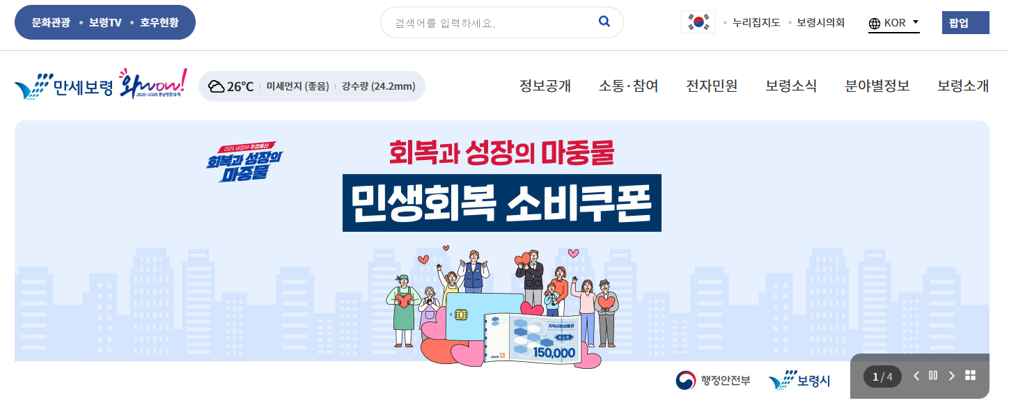 메인 화면에서는 보령시 전 시민 대상 '민생회복 소비쿠폰' 지급, 보령머드축제 발전을 위한 기부금 전달, 반려동물 친화관광도시 보령, 대천해수욕장 펫비치 운영 등 보령시의 주요 정책과 행사 정보를 실시간으로 확인할 수 있습니다.