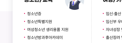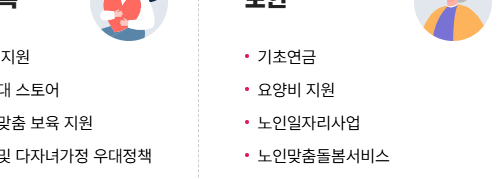 | 복지·교육 | 아동·노인·장애인 복지 서비스, 무상교육·장학금 안내 |