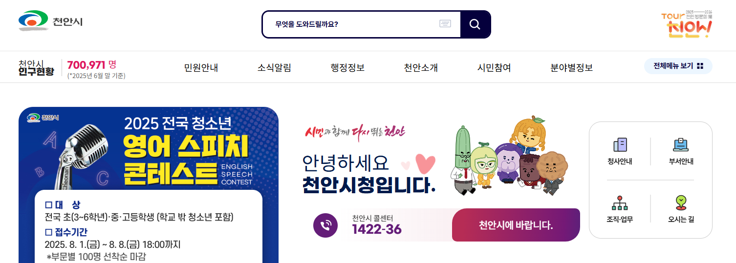 - 상단 6대 탭: 시정소식·분야별정보·전자민원·정보공개·천안소개·참여소통으로 구성해 직관적 이동 지원.