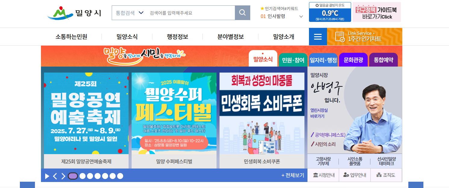 밀양시청 홈페이지에서는 시민들이 자주 이용하는 서비스들을 쉽게 접근할 수 있도록 구성되어 있습니다: