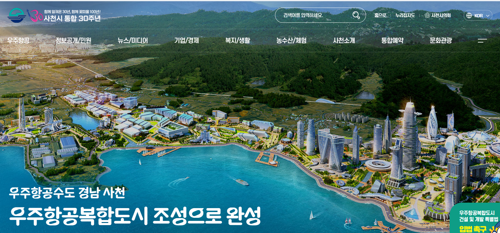 사천시청 홈페이지는 "우주항공수도 경남 사천"이라는 슬로건으로 우주항공복합도시 조성을 통한 지역 발전을 추진하고 있습니다. 2025년은 "Visit Sacheon Year 2025 사천 방문의 해"로 지정되어 하늘로 바다로 행복도시 사천으로의 방문을 적극 홍보하고 있습니다.