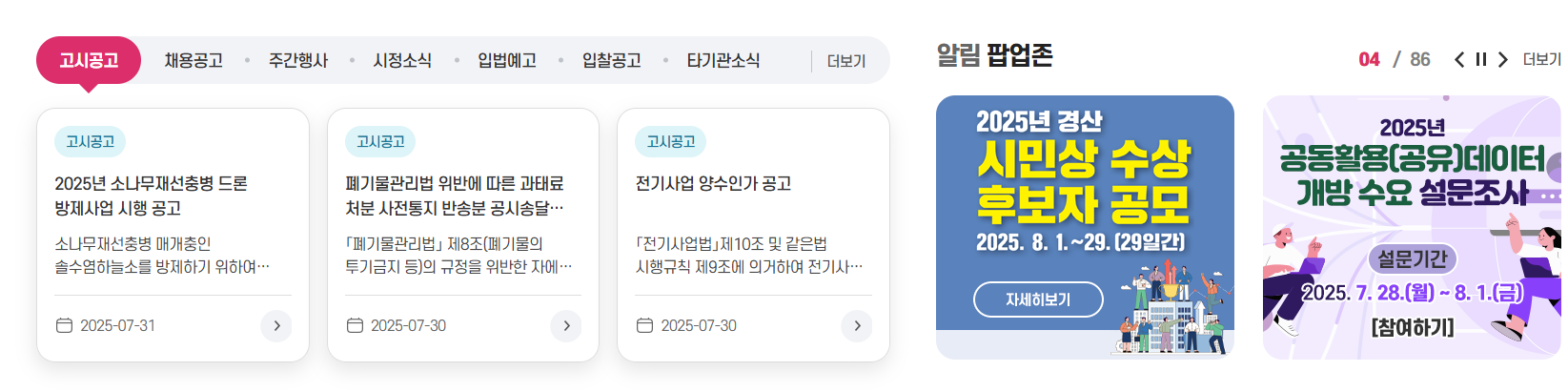 경산시청 홈페이지는 행정 정보뿐 아니라 시민들의 생활에 실질적으로 도움이 되는 정보도 폭넓게 제공합니다.