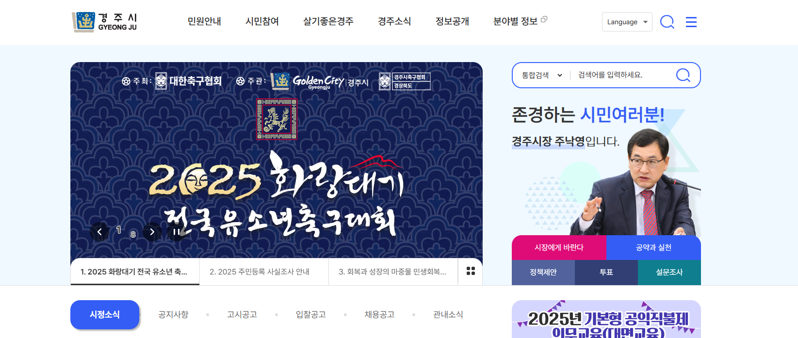 경주시청 홈페이지는 경주시에서 공식적으로 운영하는 웹사이트로, 시민들에게 행정 정보, 공지사항, 민원 서비스 등을 제공하는 온라인 창구입니다. 경주의 각종 소식을 빠르게 접할 수 있고, 다양한 행정 절차도 비대면으로 진행할 수 있어 매우 유용한 서비스입니다.