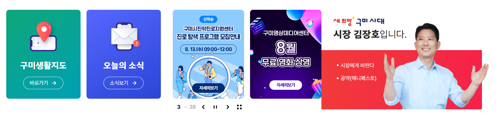 시장님의 인사말, 공약사항, 시정 비전 등이 소개되어 있어 구미시의 행정 방향을 이해하는 데 도움이 됩니다.