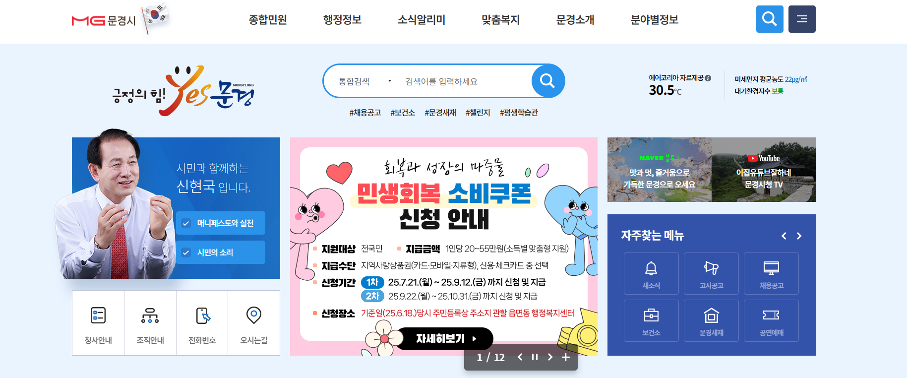 문경시청 홈페이지에는 일상생활과 밀접한 다양한 정보가 풍부하게 담겨 있습니다.