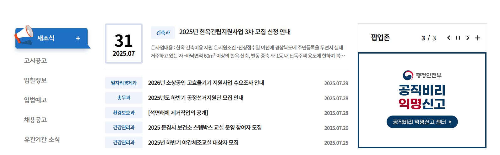 문경시에서 발표하는 공지사항, 입찰 공고, 채용 정보, 시험 일정 등을 확인할 수 있는 공간입니다. 최신 업데이트가 빠르게 반영되기 때문에 구직자나 사업자들에게 매우 유용합니다.