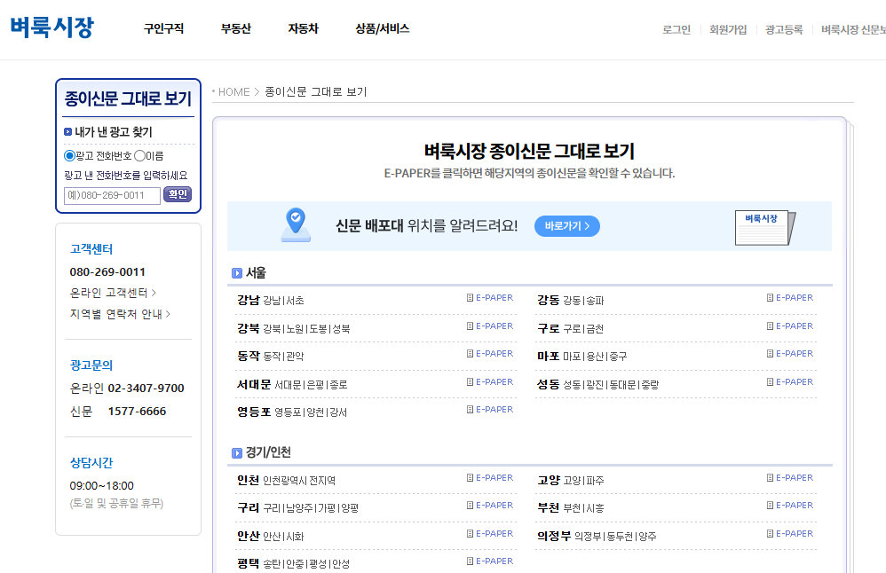 - 벼룩시장 홈페이지 접속 후 상단 '신문지역판' 클릭