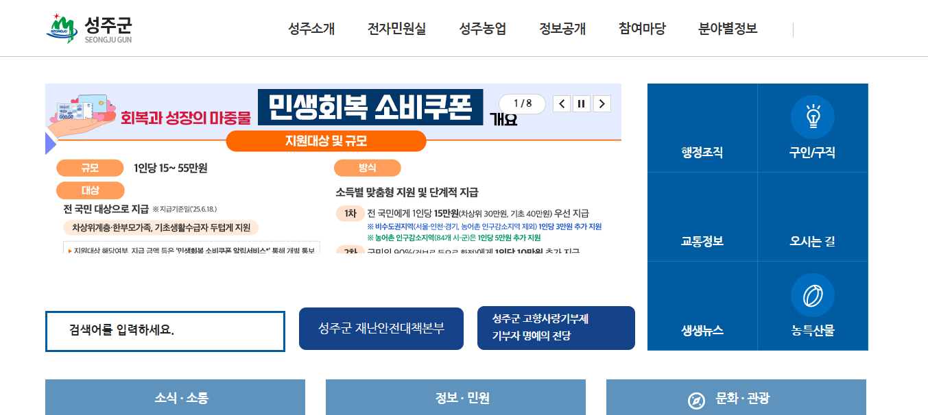 성주군청 홈페이지는 성주군의 행정 정보를 비롯해 민원 서비스, 복지 정책, 관광 안내 등 군민과 방문객 모두를 위한 종합 온라인 플랫폼입니다.
