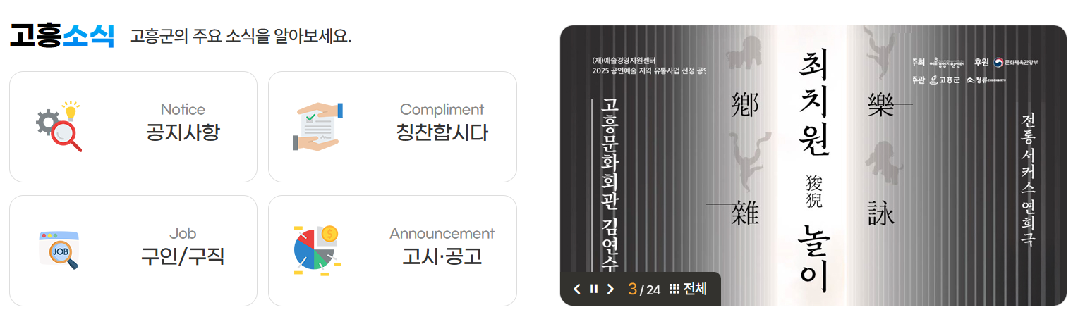 이 카테고리를 통해 고흥군에서 진행 중인 정책, 행사, 공사 일정 등을 확인할 수 있습니다. 특히, 군민들이 실생활에 필요한 정보들이 상세히 제공되어 큰 도움이 됩니다.