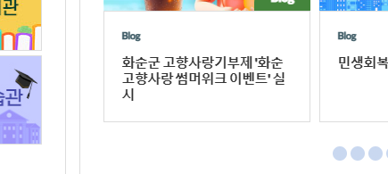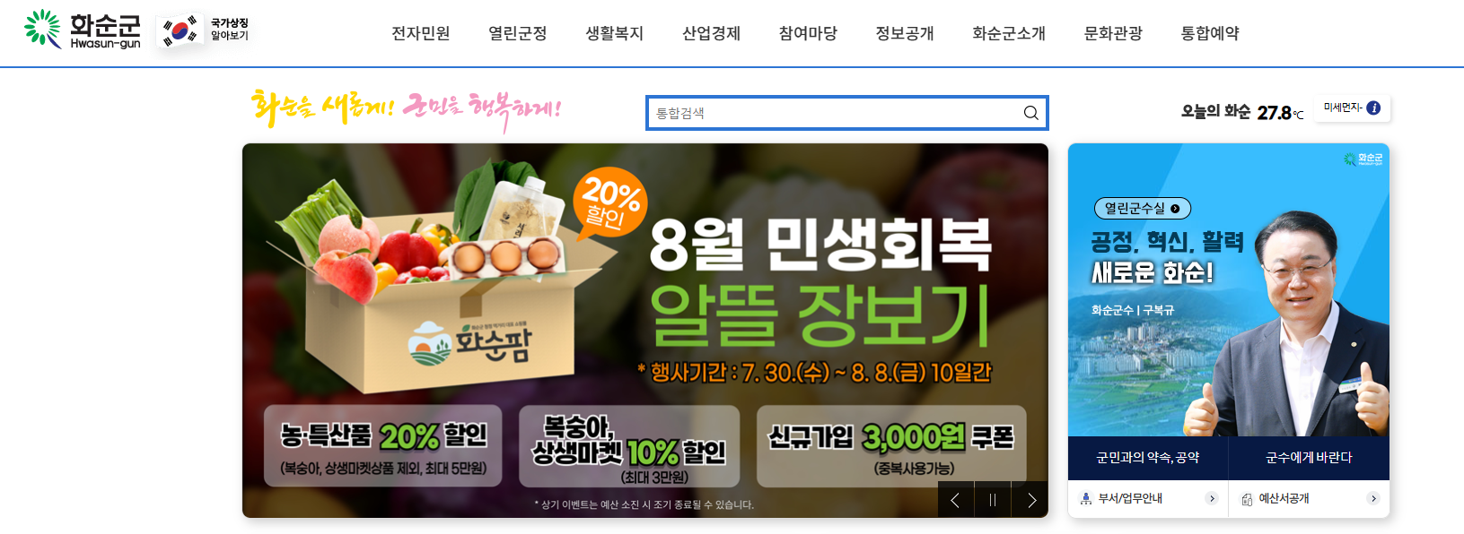 화순군청 홈페이지는 행정 정보는 물론 군민의 생활에 꼭 필요한 정보를 종합적으로 제공하는 디지털 창구입니다. 행정기관과 주민을 이어주는 소통의 통로로서, 친절하고 실용적인 콘텐츠로 구성되어 있어 누구나 쉽고 편리하게 이용할 수 있습니다. 화순에 거주 중이거나 관심이 있는 분이라면 화순군청 홈페이지를 꼭 활용해보시길 바랍니다. 매일 업데이트되는 새로운 정보를 통해 화순군의 다양한 소식을 접해보세요.