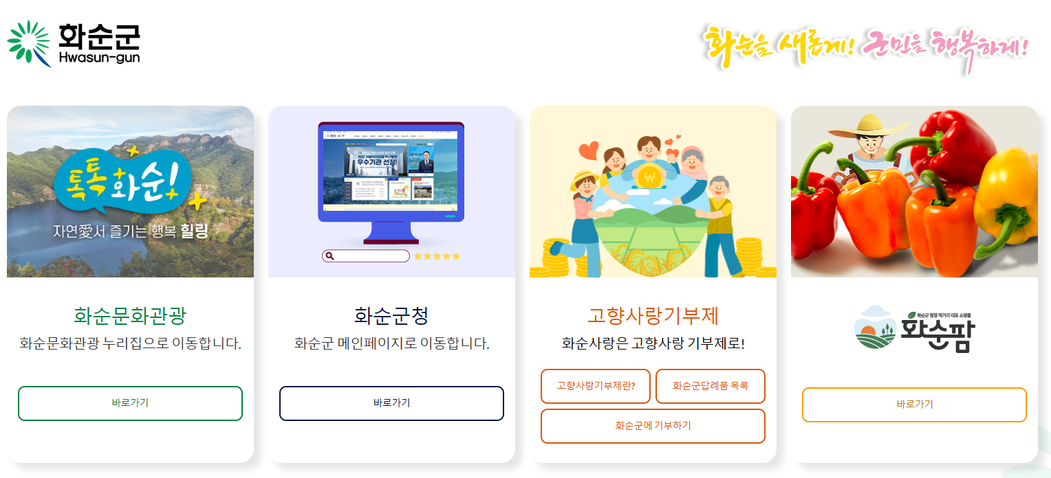 화순군청 홈페이지는 화순군이 공식 운영하는 대표 웹사이트로, 군정 소식, 민원 서비스, 공공 정보, 관광 안내 등 다양한 정보를 군민에게 제공합니다. 사용자 중심의 디자인과 접근성 높은 메뉴 구성으로 누구나 쉽게 이용할 수 있도록 만들어졌습니다.