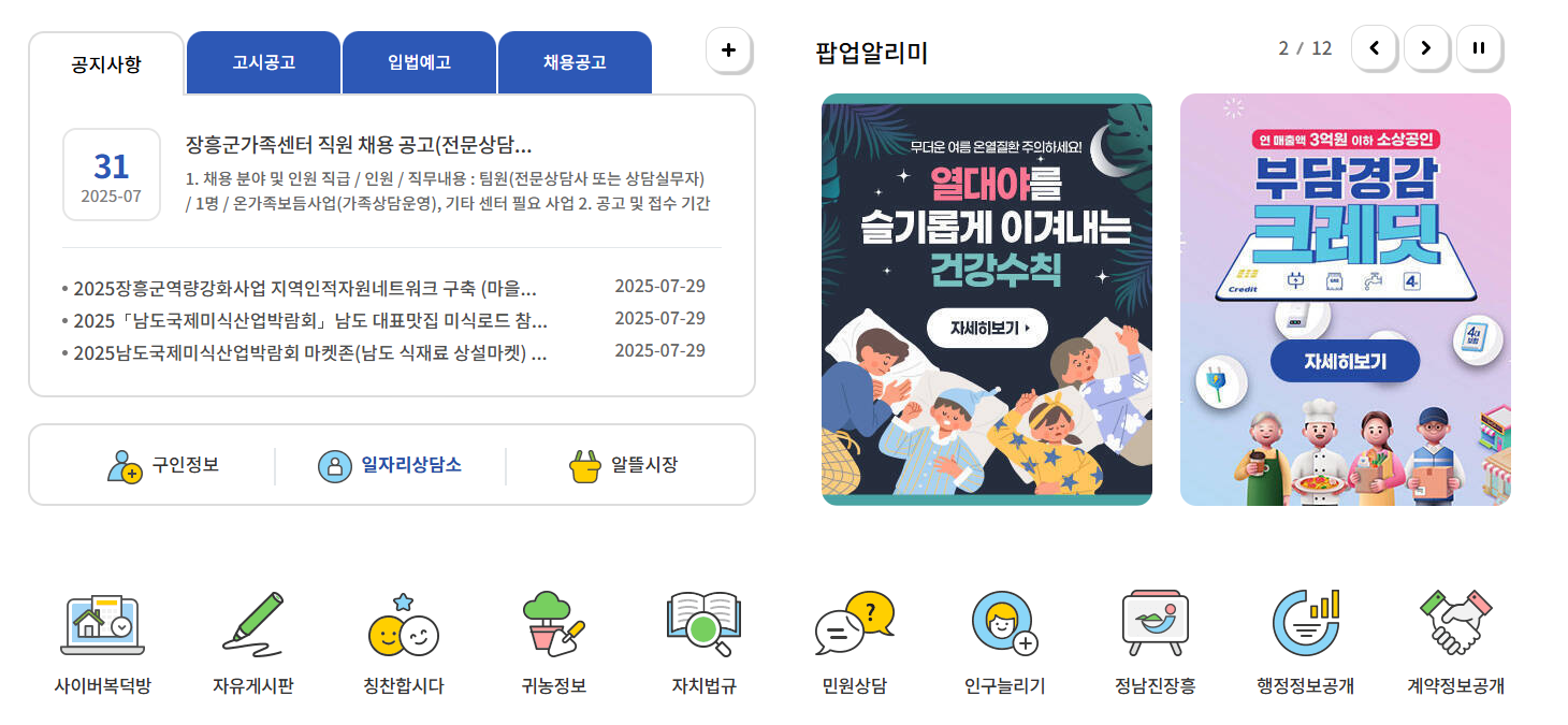 장흥군청 홈페이지 내에서 군민들이 자주 이용하는 대표적인 서비스는 다음과 같습니다.