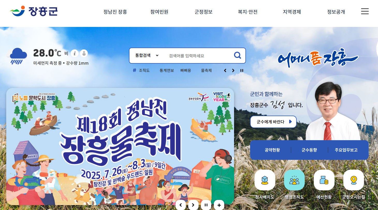 장흥군청 홈페이지는 장흥군의 행정 서비스와 정보를 통합하여 제공하는 핵심 플랫폼입니다. 군민은 물론 외부 방문객에게도 매우 유익한 자료를 제공하고 있으며, 온라인을 통해 손쉽게 행정 서비스를 이용할 수 있도록 구성되어 있습니다.